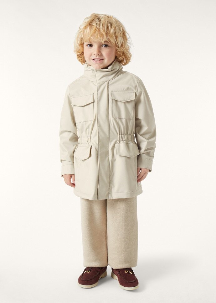 Traversing the realms of tradition and innovation, we arrive at the Traveler jacket, an icon that embodies the ethos of Loro Piana, while at the same time being enhanced by fresh textures and delicate intricacies. This mini-me version of the iconic outerwear garment offers both style and functionality for your little adventurer’s journeys. Perfect for exploring the outdoors, its exclusive Windmate® Stretch Storm System® treated fabric provides protection from the wind and rain.