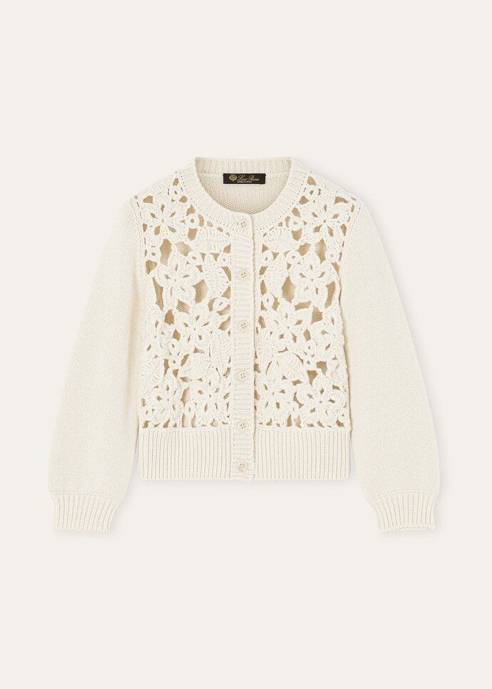 Intricate hand-crocheted foliage motifs bloom across the front of the Winter Garden cardigan, imbuing its soft cotton and cashmere fabric with textural interest. Framed by lightly ballooned sleeves, the design is ribbed throughout and fastened with mother-of-pearl buttons for a composed finish.