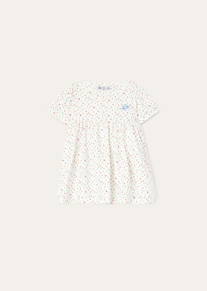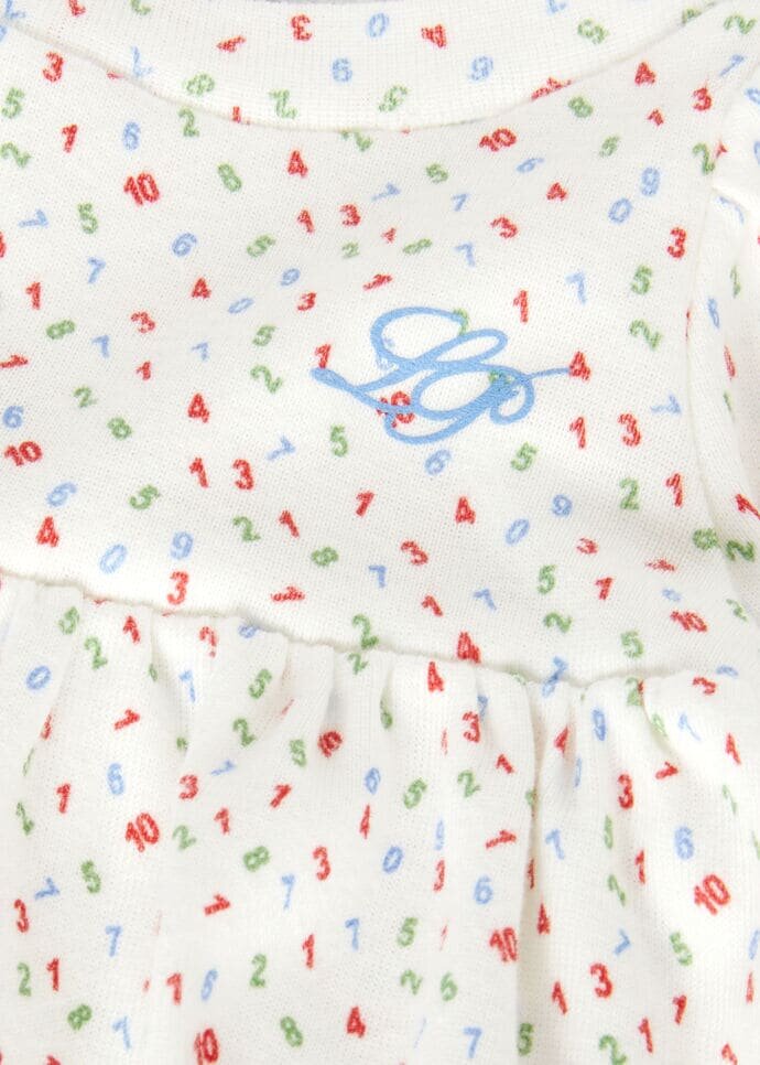 Crafted from extremely soft, comfortable, cotton jersey, this high-waisted dress features a flared skirt, bodysuit, boat neck and puffed sleeves. Thanks to the use of ribbing, the fabric is naturally stretch and lightweight. A fun, delicate “Little Numbers” pattern completes the look.