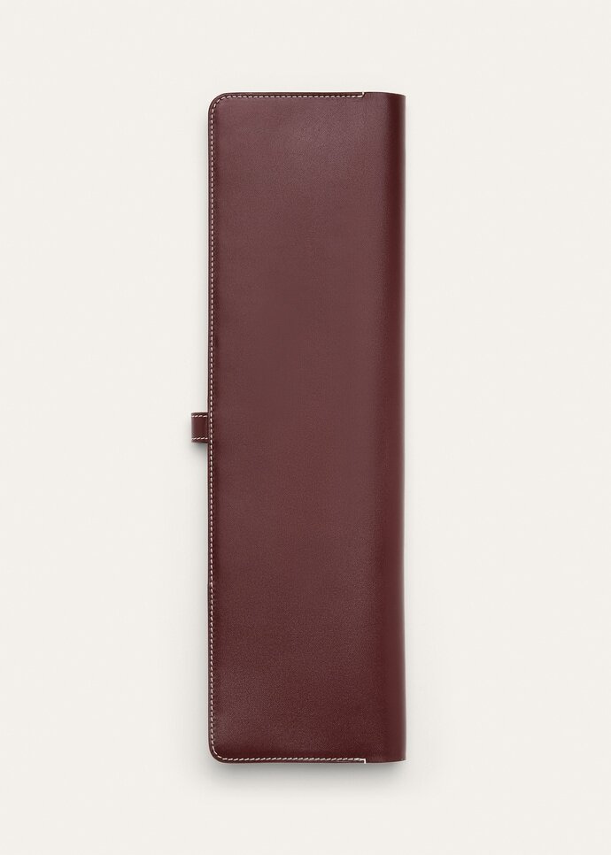 A practical accessory for the modern traveler, the refined Guardaroba holder keeps ties neatly organized and fresh. It is rendered in supple Saddle Leather, finished with intricate topstitching, and accented with a hot-stamped logo on the outer. Classic and versatile, it accommodates one tie on either side, which are looped around the metal rings at the top and held in place with the leather tab at the base.