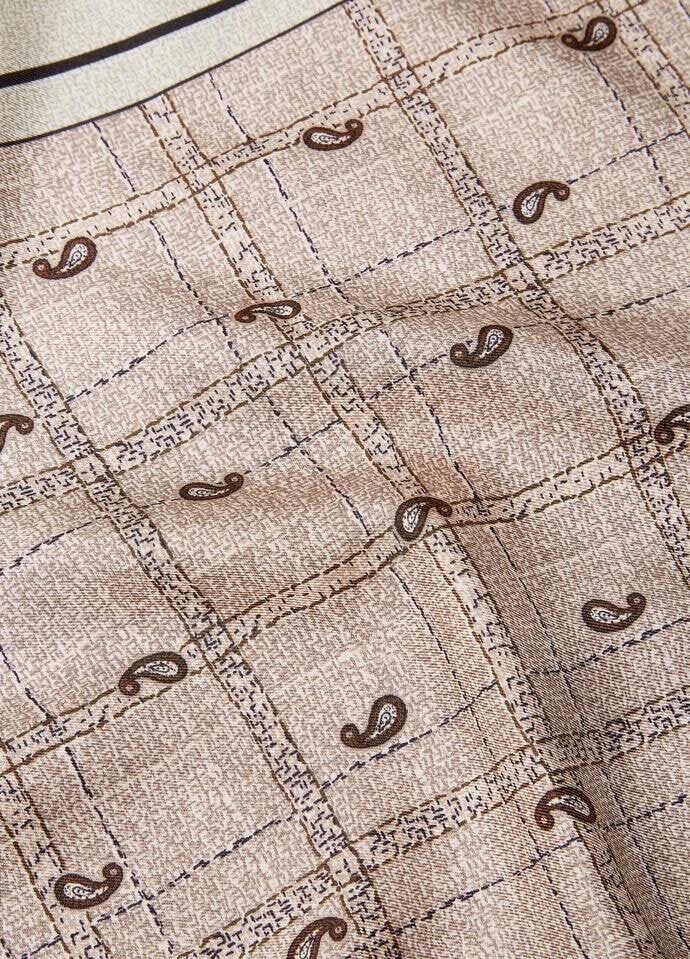 The Boteh pocket square reflects Loro Piana’s rich heritage, beautifully complementing any ensemble with understated finesse. A true masterpiece of design and craftsmanship, this sophisticated piece in elegant silk has a check base decorated with an all-over paisley design. This intricate pattern is created using a complex screen-printing technique and framed by bold concentric squares. The soft, supple texture of the silk and the rich, vibrant colors of the paisley motif combine to create an enchanting piece.