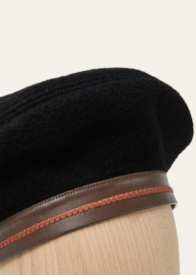 Expertly shaped from felted wool, the Ali hat is marked by its compact structure and clean, sculptural line. The inner is bordered in plongé leather, enriched with Kummel-hued embroidery and meticulously hand-lacquered edges, affirming the Maison’s attention to detail. A discreet tonal grosgrain loop completes the design on a polished note.