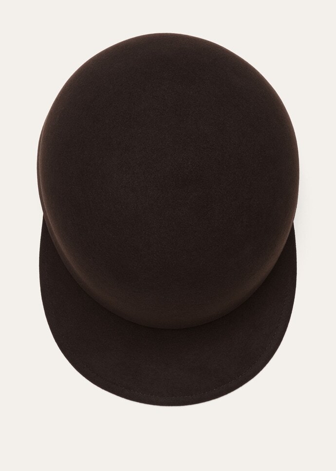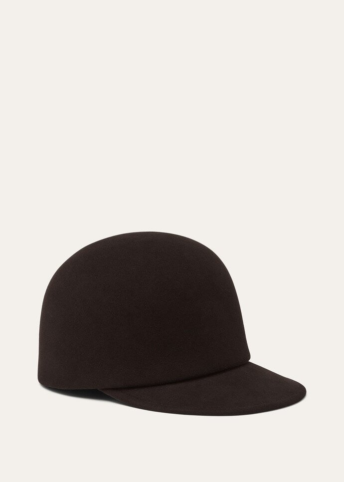 Equestrian inflections lend the Alma hat from the Loro Highlands Capsule collection its distinctive character. Shaped with a rounded crown and a softly curved peak, it is edged in precise stitching to evoke the classic riding cap. It is crafted from My Felt – a naturally lustrous, velvety rabbit fur felt – and imbued with water-resistant properties. An inner band in Kummel-colored grosgrain lends subtle contrast and a signature touch.