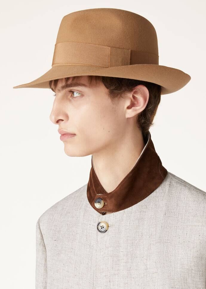 Honoring heritage while embracing evolution, the Pier hat reflects the eternal grace of Loro Piana. A classic men’s fedora, it is masterly crafted from velor-effect rabbit-fur felt and treated with a water-resistant finish to provide a luxurious feel and durability. Characterized by its structured silhouette, this smart accessory lends a timeless elegance.