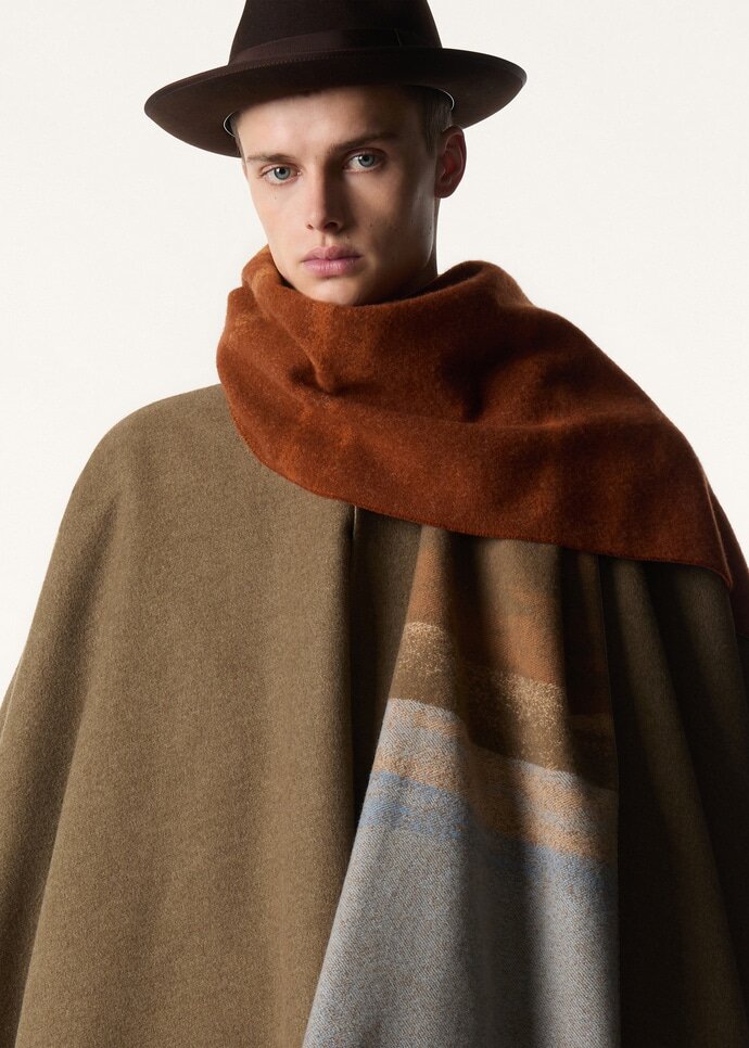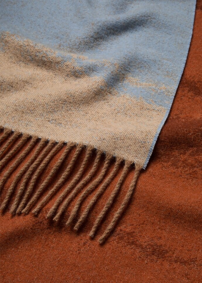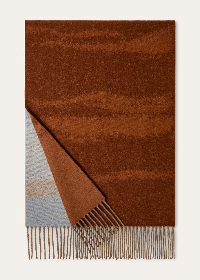 Jacquard-woven from cashmere, the Landscape foulard offers a soft, tactile finish and chromatic depth. It is finished with a refined watercolor effect, blending warm gradients that shift gently from end to end like a hand-painted landscape. Twisted fringes in a contrasting shade sign off the piece with a final artisanal touch.
