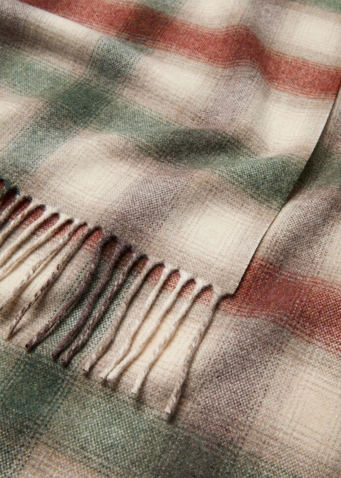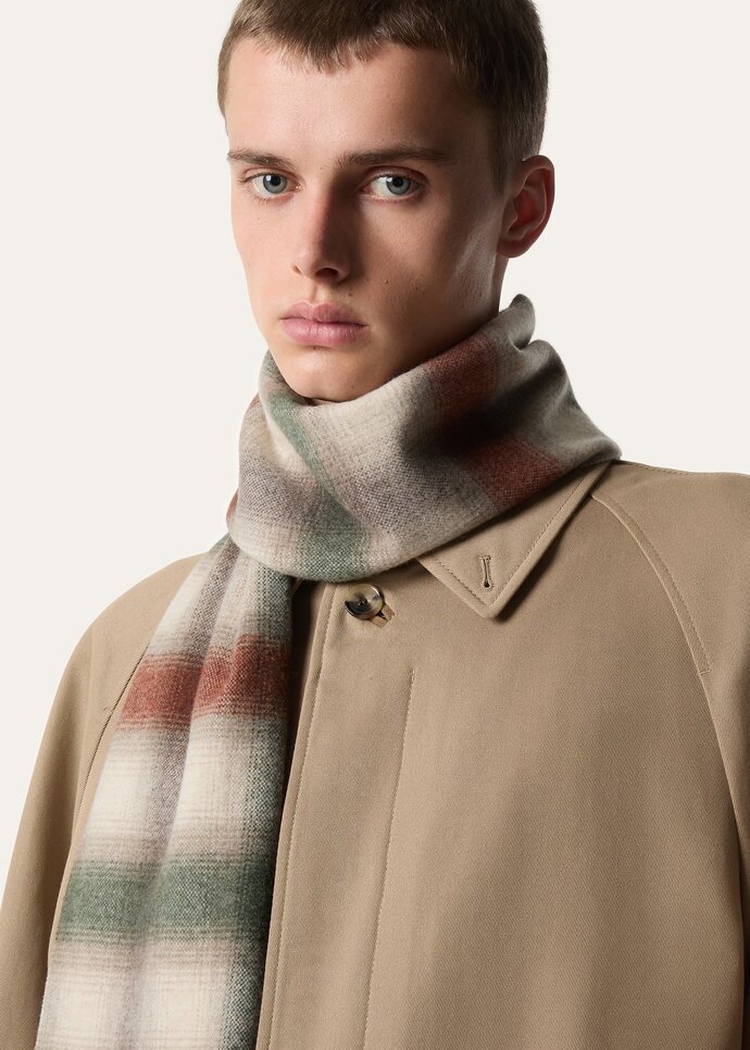 Softly brushed for warmth and depth, the Tartan Scarf is rendered with a sense of easy refinement. It is woven from Wish® Flannel, fused with touches of cashmere, and then fulled for a raised nap and rich tactility. It is decorated with a reinterpretation of the iconic Belt pattern, paired with fringed ends for a delicate balance of texture and movement.