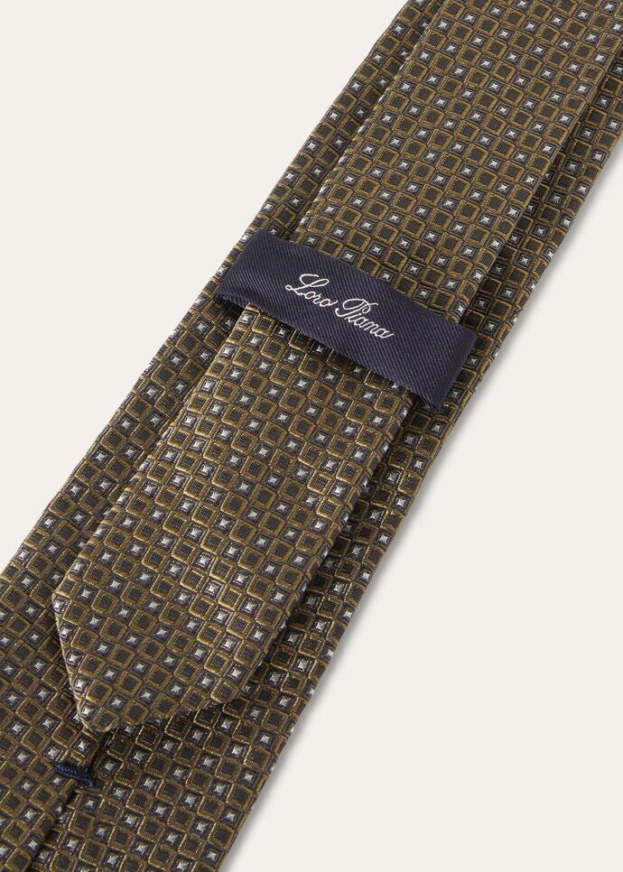 In the grand tapestry of the collection, accessories are the golden threads that weave together past and present, each subtly symbolizing the brand’s century-long commitment to uncompromising elegance. A symphony of subtle elegance, this silk jacquard tie with its intricate microcheck design catches the light with a soft sheen that hints at the exceptional quality of the fabric. With its understated pattern and exquisite craftsmanship, it is the perfect finishing touch to a tailored suit and crisp white shirt.