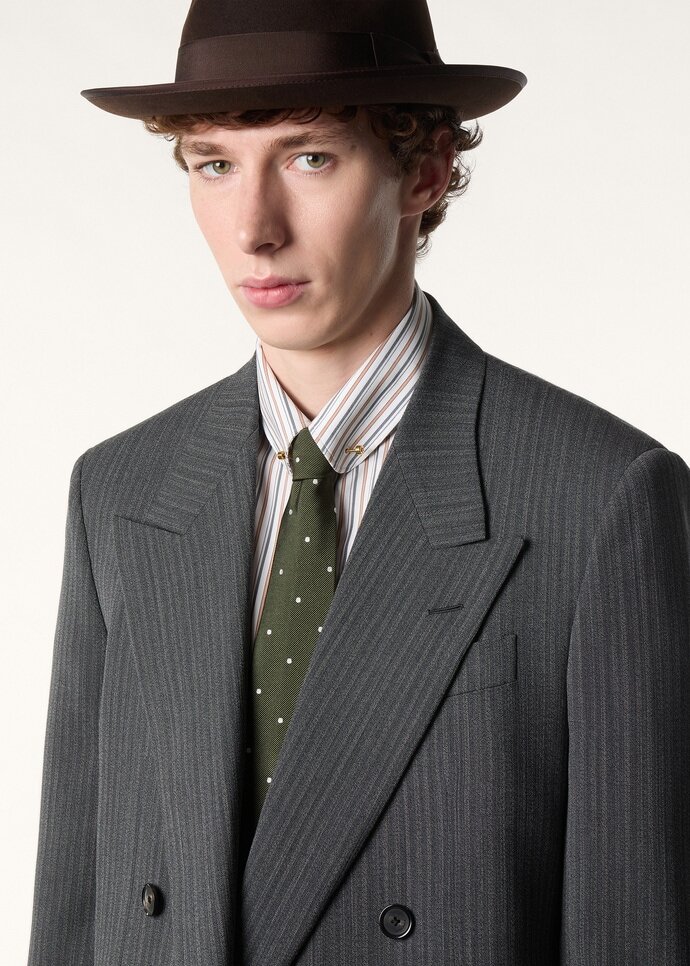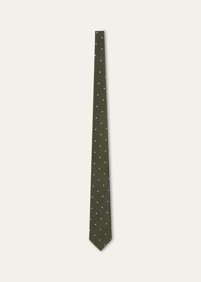 In the grand tapestry of the collection, accessories are the golden threads that weave together past and present, each subtly symbolizing the brand’s century-long commitment to uncompromising elegance. The classic printed pure silk tie with its playful yet sophisticated polka dot pattern is made from a luxurious fabric that falls beautifully. The ideal addition to any smart ensemble.