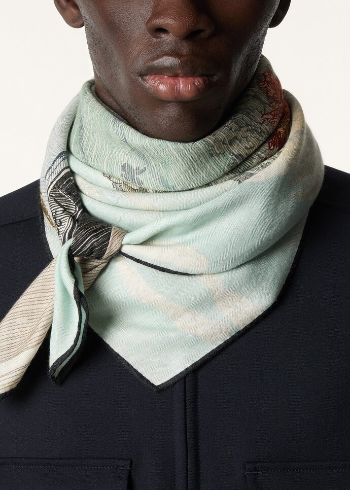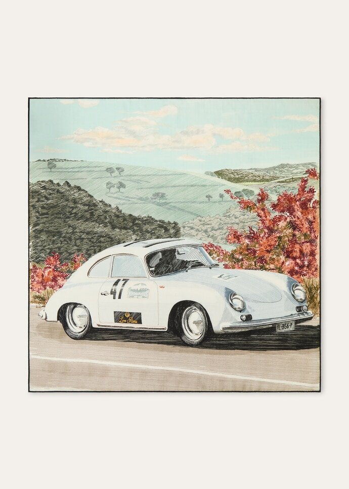 A nod to the Maison’s enduring affinity for vintage motor sports, the Racing foulard is rendered in a refined blend of silk and cashmere that captures the scene with incredible precision. Meticulously screen-printed, the motif sees a race car gliding across rolling hills beneath an open sky. Contrasting hand-rolled hems frame the piece for a considered finishing touch.