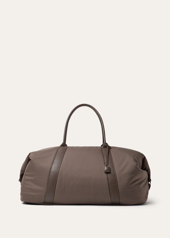 This lightweight travel bag seamlessly blends sporty functionality with timeless elegance. <BR>The double zip closure and dual internal pockets ensure efficient organization of personal belongings. Inspired by the distinctive Loom design, the leather handles exude sophistication, while embossed feet on the bottom enhance stability and add a touch of style. Completing the bag’s functionality are three internal pouches, designated for WET, DRY and SUN, respectively. It is crafted in the iconic wind Storm System® with smooth calfskin trims.