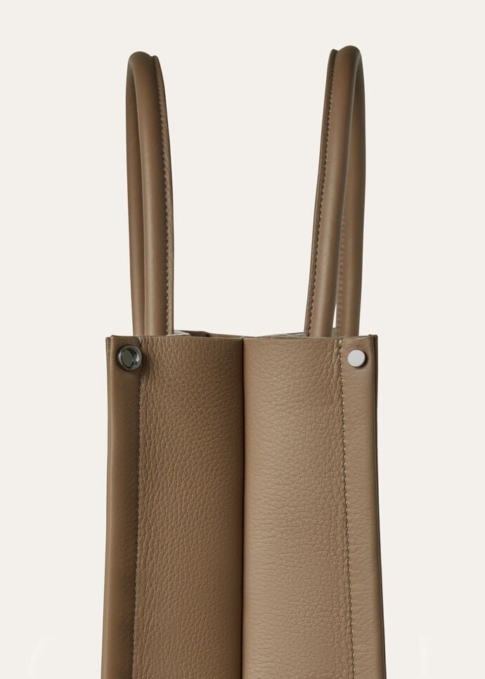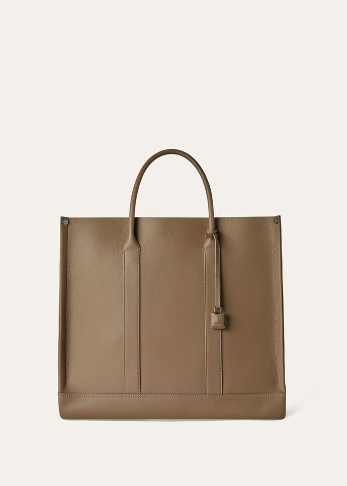 The small Beam tote bag combines practicality and refinement, with its handy design and soft calfskin leather evoking luxury. Named after the beam, an essential part of the loom, this bag pays homage to Loro Piana’s rich textile heritage. Its expandable base, inspired by the shape of the beam itself, allows for adaptable volume and versatility, while the contrasting soft calfskin trim and handles add a touch of luxurious sophistication.