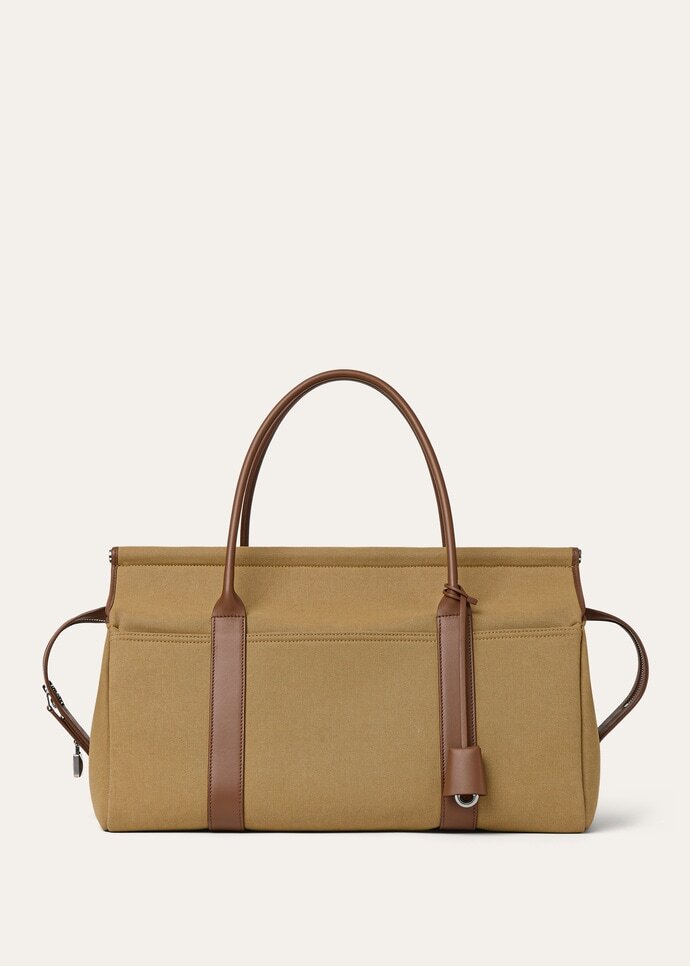 The Loom Weekender L42 pays homage to Loro Piana’s century-spanning heritage in fabrics and fibers – the metal bar beneath the flap evoking the gentle cascade of cloth draped across the textile loom. Crafted in cotton canvas with a sporty feel, it is anchored with a refined padlock that can be worn closed or open for a more relaxed look that retains its signature charm. The timeless accessory is ideal for carrying in hand.
