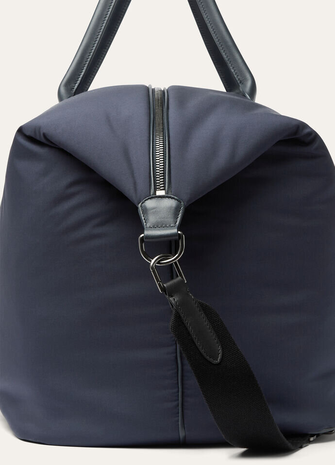 This lightweight travel bag seamlessly blends sporty functionality with timeless elegance. <BR>The double zip closure and dual internal pockets ensure efficient organization of personal belongings. Inspired by the distinctive Loom design, the leather handles exude sophistication, while embossed feet on the bottom enhance stability and add a touch of style. Completing the bag’s functionality are three internal pouches, designated for WET, DRY and SUN, respectively. It is crafted in the iconic wind Storm System® with smooth calfskin trims.