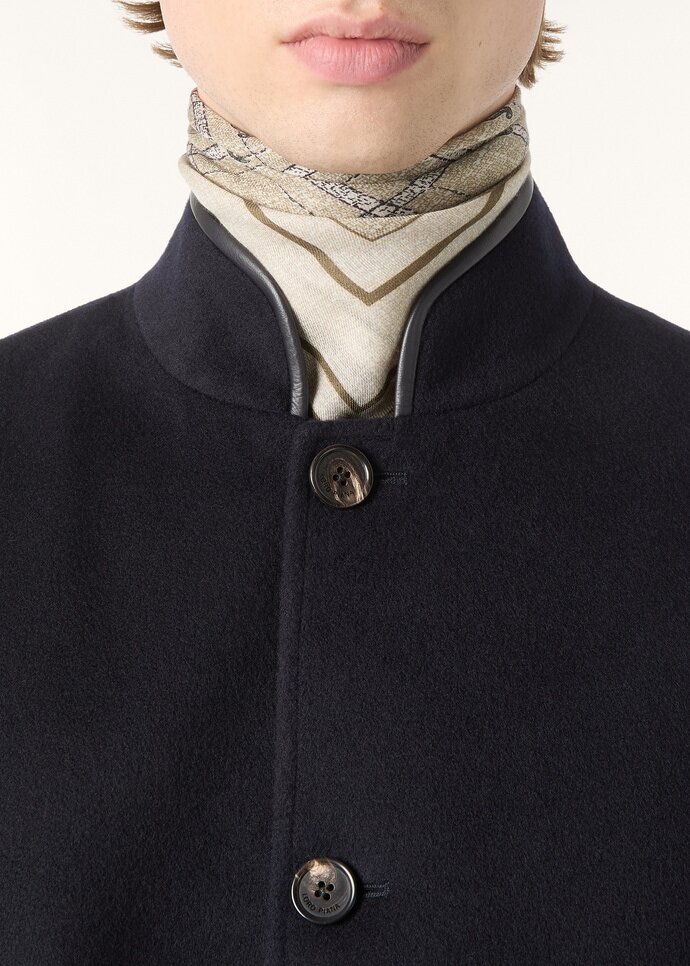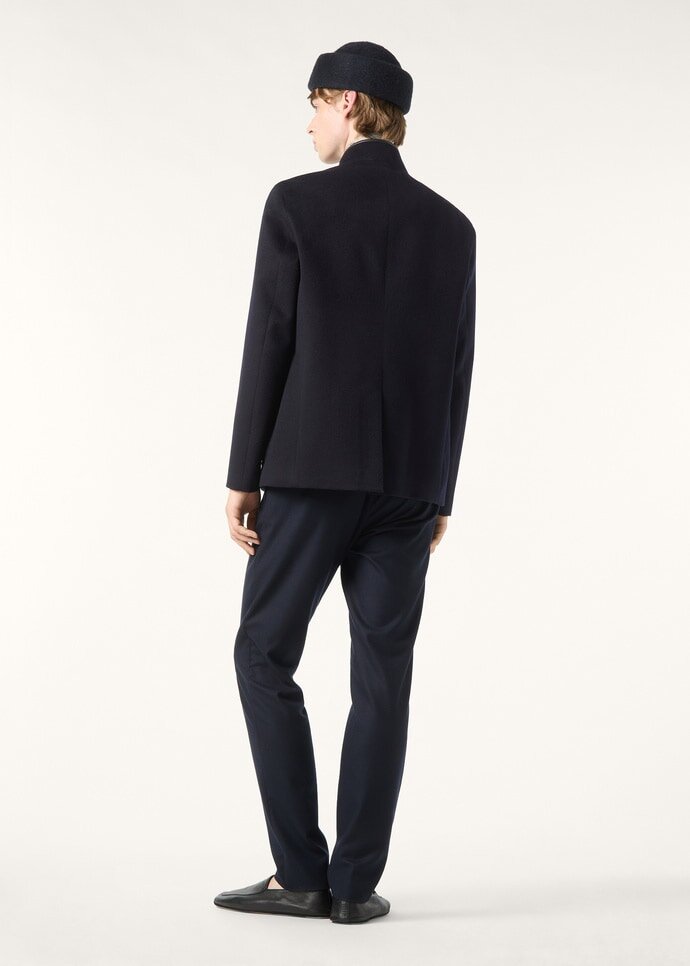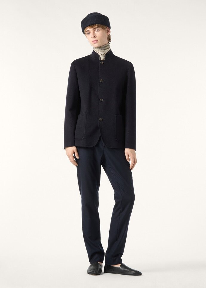 First introduced in 1998, with cues taken from the Spanish officer uniform, the iconic Spagna jacket combines a formal silhouette with a refined construction for ultimate comfort and ease of movement. It is defined by a standing collar and has a clean straight line. Ideal for the transitional months, its cashmere fabric is merged with a technical fiber and coated with a layer of Storm System® for protection against the elements.