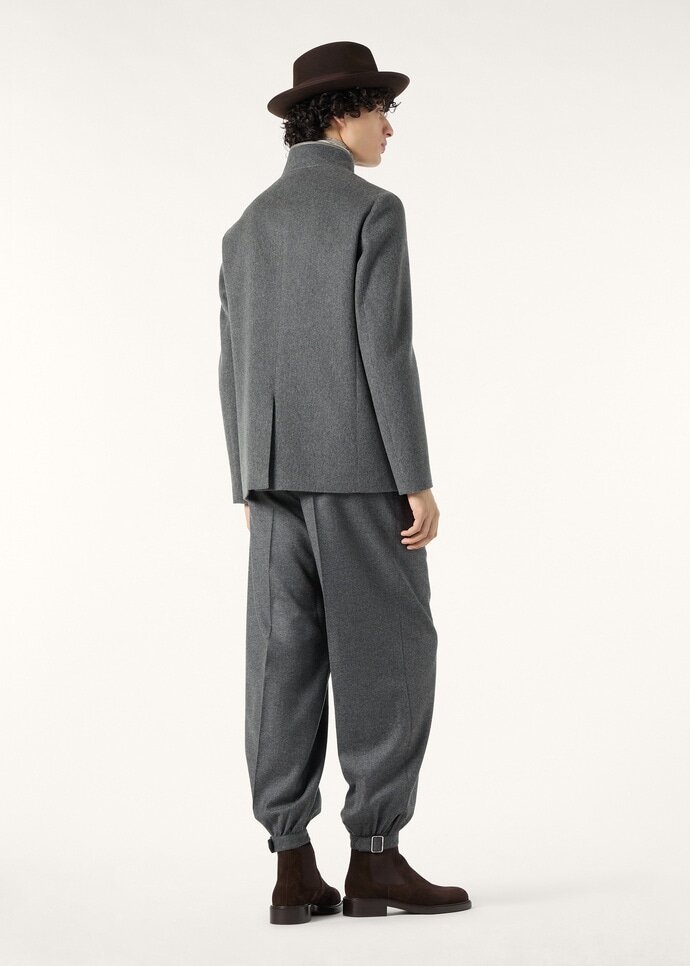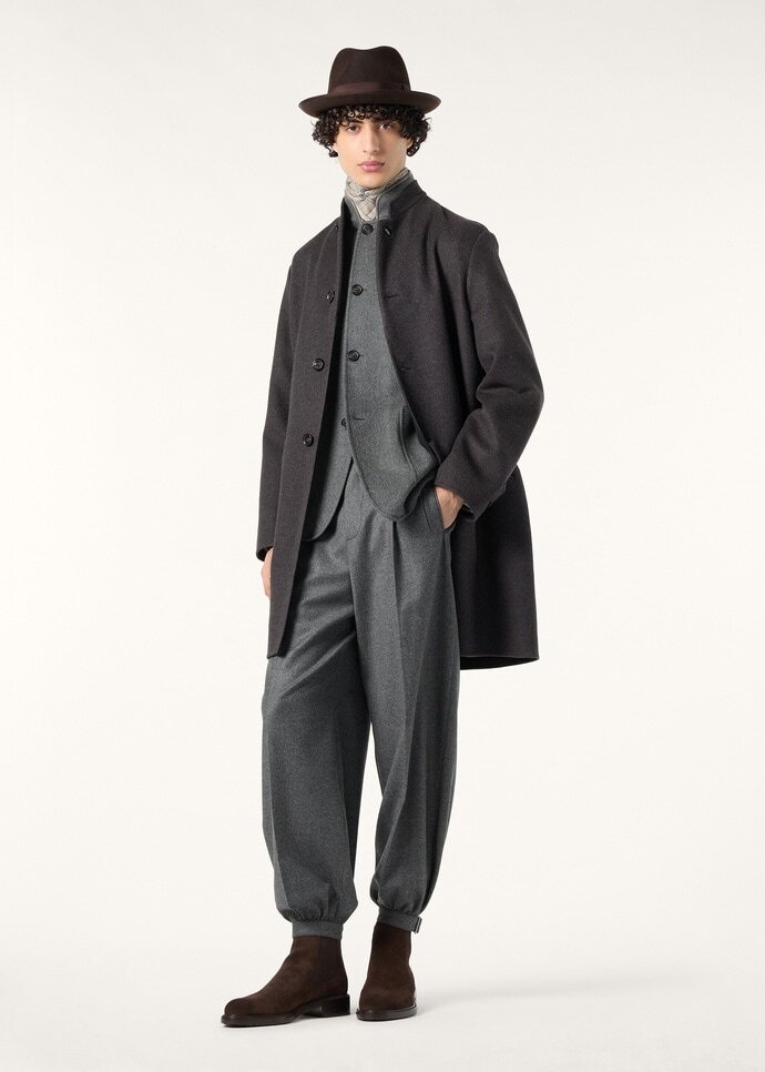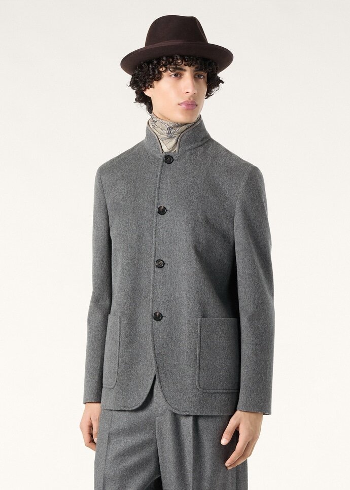 First introduced in 1998, with cues taken from the Spanish officer uniform, the iconic Spagna jacket combines a formal silhouette with a refined construction for ultimate comfort and ease of movement. It is defined by a standing collar and has a clean straight line. Ideal for the transitional months, its cashmere fabric is merged with a technical fiber and coated with a layer of Storm System® for protection against the elements.