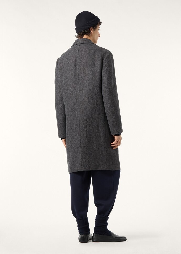 Rendered in Cash Linen Double, the John coat presents a classic line with tactile depth and understated structure. The double-faced fabric – broken twill on one side, refined weave on the other – blends woolen and worsted cashmere with printed mélange linen for a full-bodied drape and a chromatic effect. Considered details complete this single-breasted style on a polished note, from the Melton undercollar to the twill shoulder lining.
