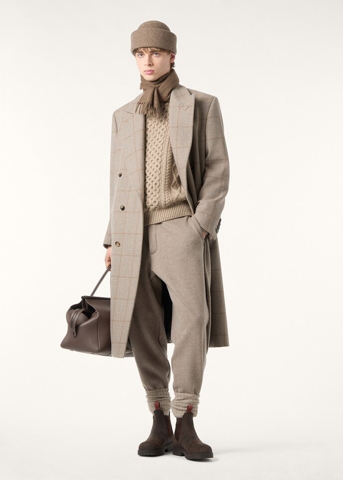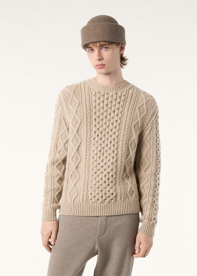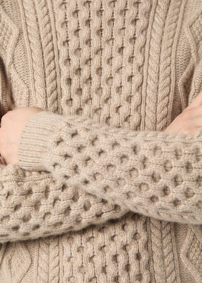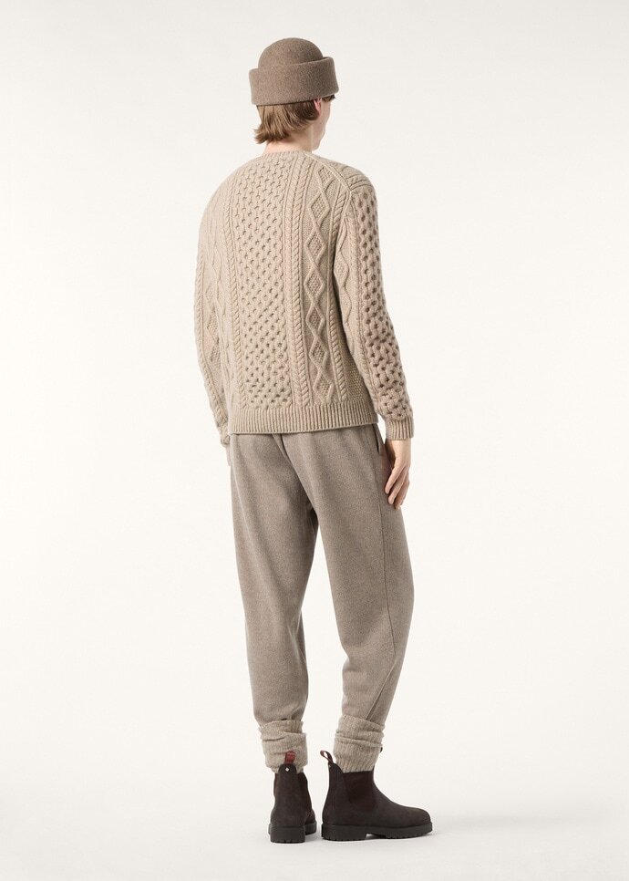 An intricate arrangement of cable and openwork stitches enriches the Eyre sweater with tactile nuance. It is spun from precious baby cashmere—collected only once from the downy underfleece of infant hircus goats—and lends a sense of unmatched softness. Ribbed edges frame the round-necked silhouette for a considered finish.