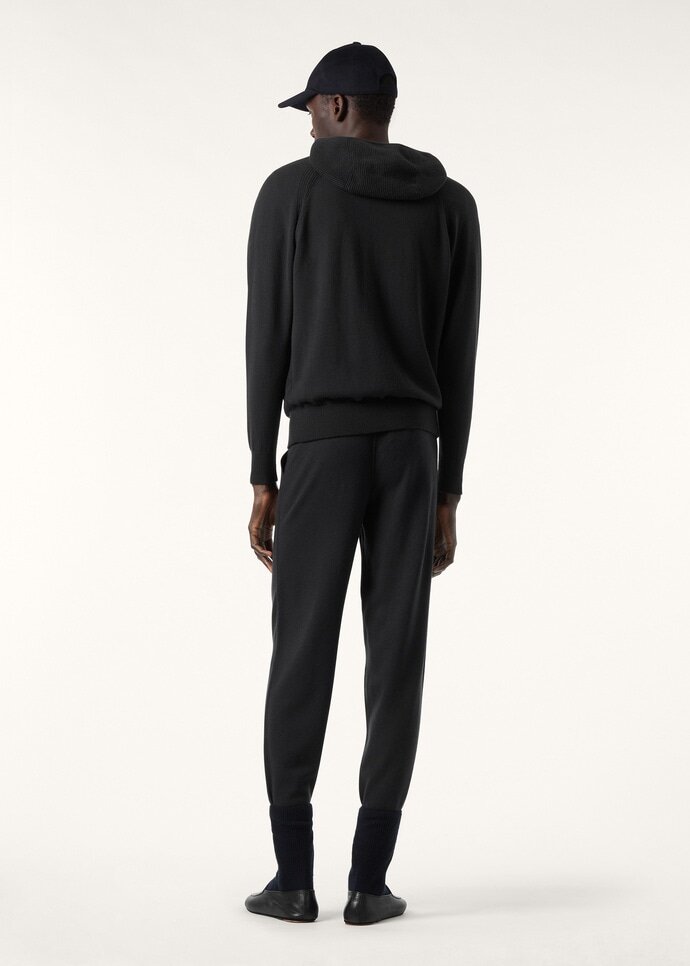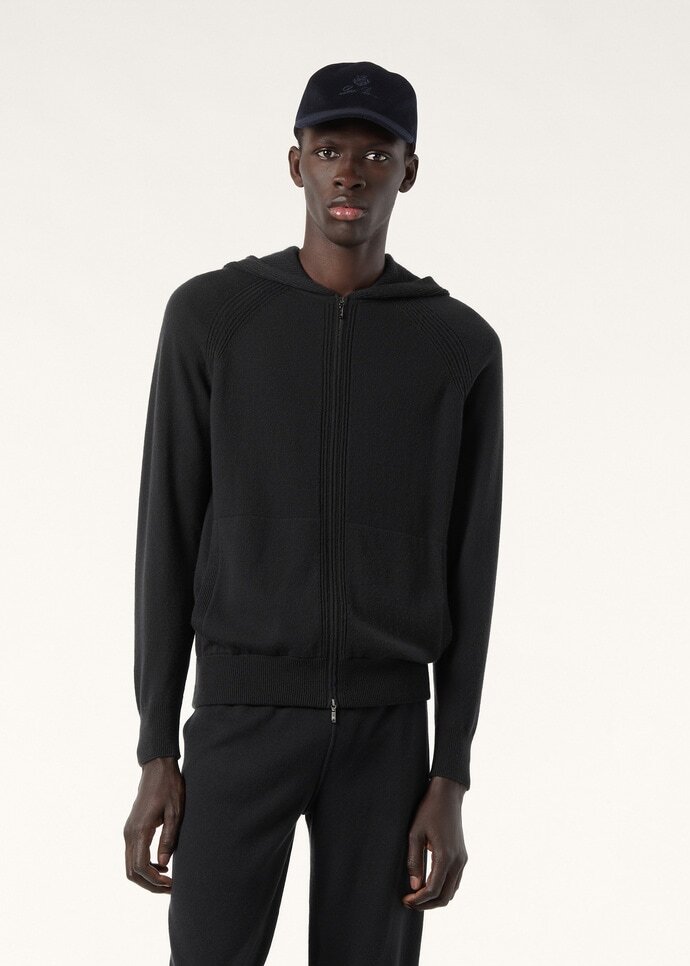 Hooded bomber jacket made from extremely lightweight baby cashmere yarn. When worn with matching Merano pants, this flowing, sporty style creates a comfortable athleisure tracksuit.