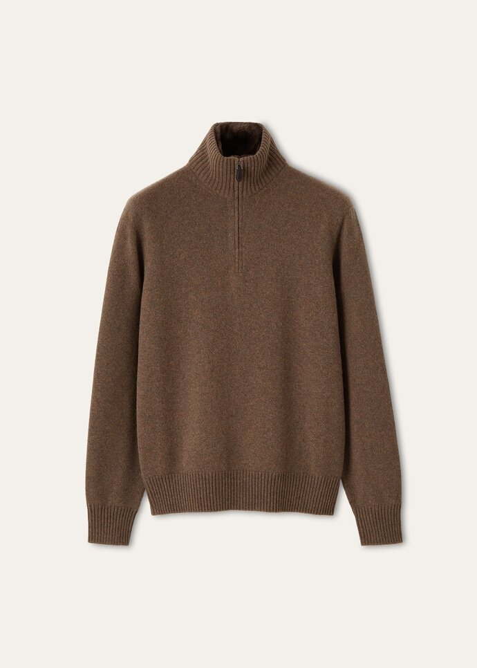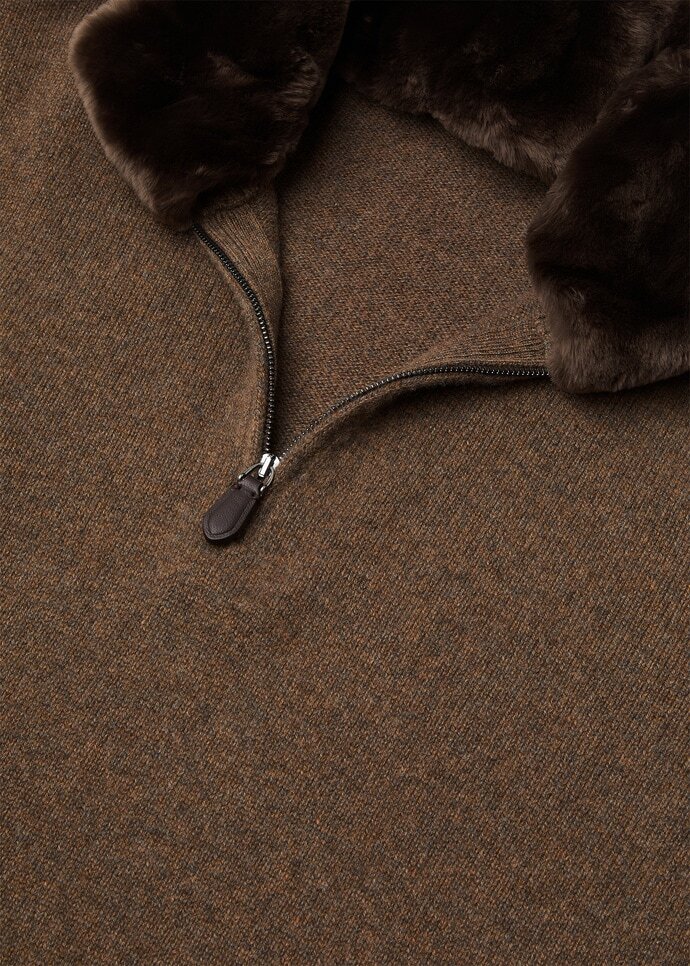 Designed for maximum warmth and tactility, the Parksville sweater is rendered in sumptuously soft baby cashmere, garnered from the precious fleece of infant hircus goats. It is framed by ribbing throughout and finished with a practical half-zip neckline for ease of wear. The collar—detachable for added functionality—is lined in sensorial Castorino fur.