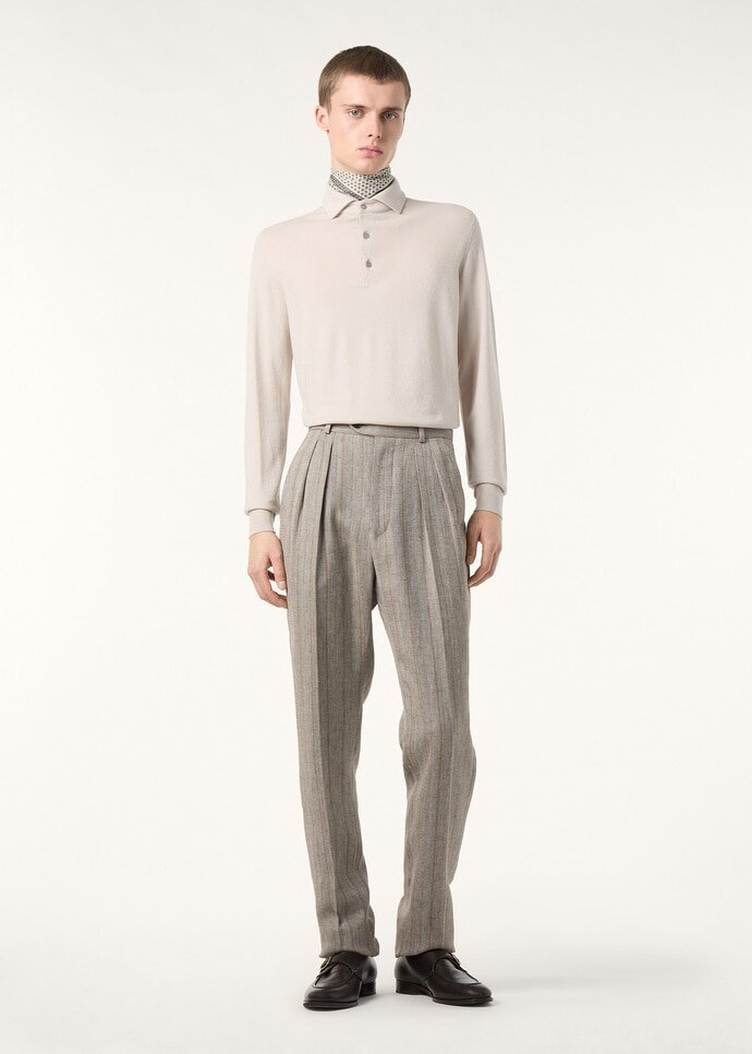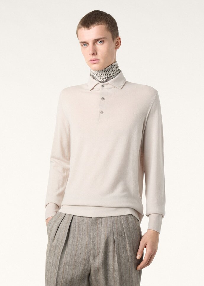 Long-sleeved polo-shirt in baby cashmere, garment dyed and crafted using an exclusive technique developed to achieve supremely light-weight knitwear. Ultra-soft, warm and fine, perfect under a jacket for casual looks in the city.