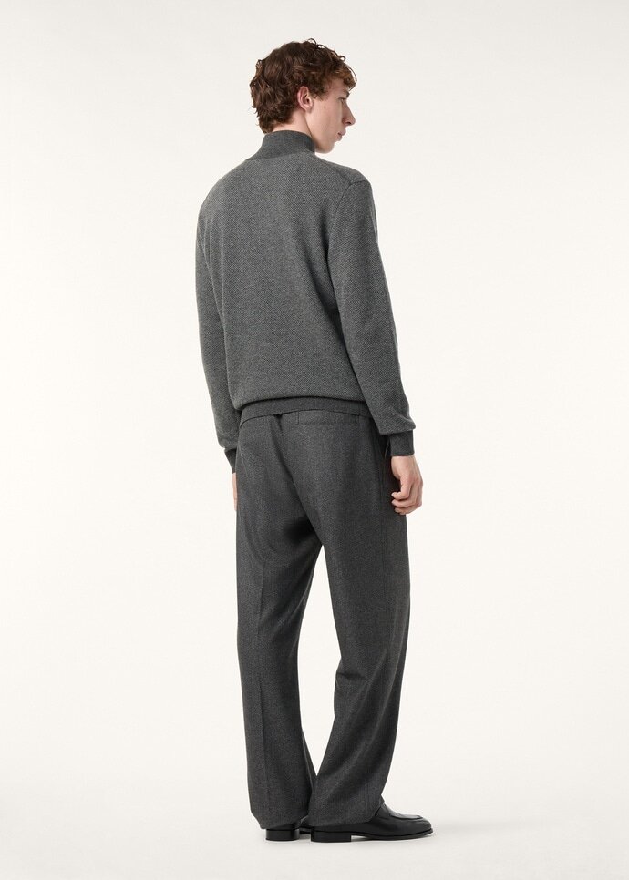 Inspired by the iconic jacket of the same name, the Roadster sweater is designed for those who are always en route, at the wheel and beyond. It is spun from ultra-soft cashmere yarns in a two-tone motif that runs diagonally across the garment. Sculpted with a high zipped neckline, this versatile layer complements the apparel of classic car drivers.