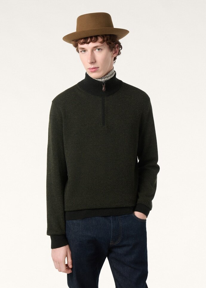 Inspired by the iconic jacket of the same name, the Roadster sweater is designed for those who are always en route, at the wheel and beyond. It is spun from ultra-soft cashmere yarns in a two-tone motif that runs diagonally across the garment. Sculpted with a high zipped neckline, this versatile layer complements the apparel of classic car drivers.