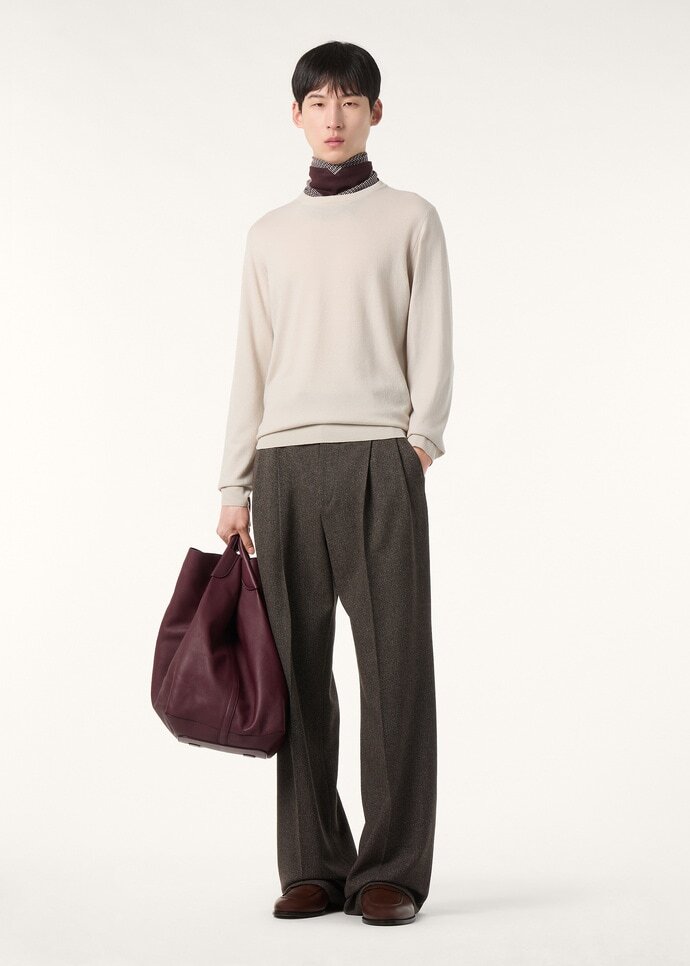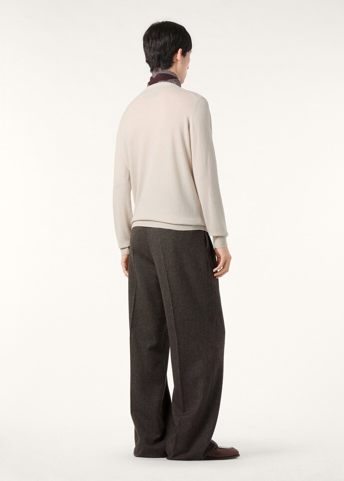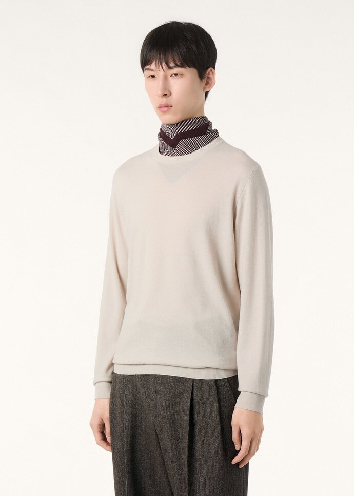 Crewneck in downy baby cashmere yarn, garment dyed and crafted using exclusive techniques to accentuate the natural feather-light softness of the fibre. Hip length, styled with a classic cut, ideal for refined leisure time outfits.