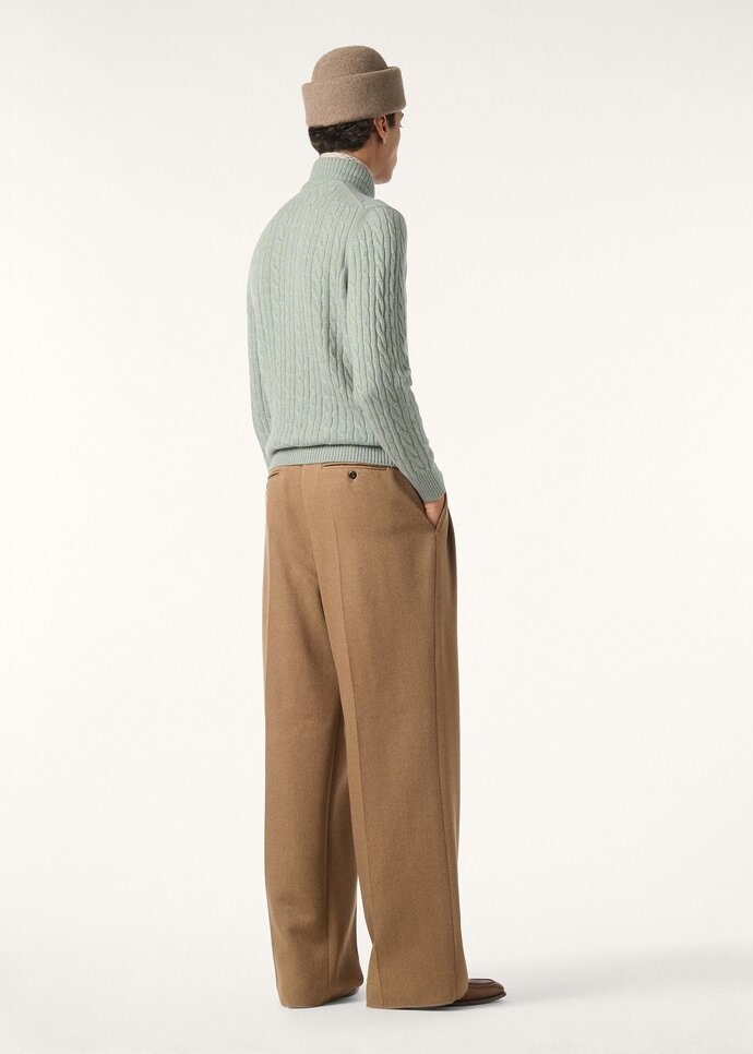 Mezzocollo baby cashmere sweater in mélange colourway featuring cables worked in two different sizes. The distinctive colour and texture give this sweater an inviting, enveloping look. Refined but extremely warm, the ideal knitwear for leisure in the city.
