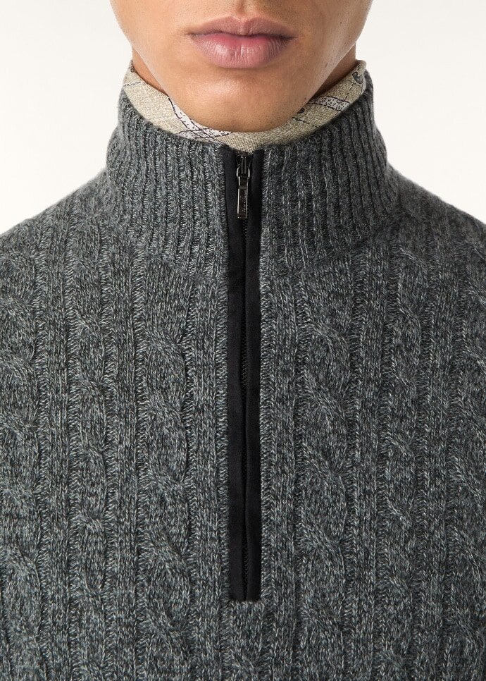 Mezzocollo baby cashmere sweater in mélange colourway featuring cables worked in two different sizes. The distinctive colour and texture give this sweater an inviting, enveloping look. Refined but extremely warm, the ideal knitwear for leisure in the city.