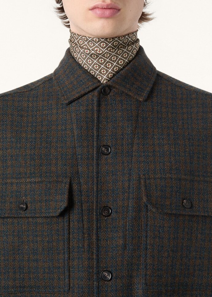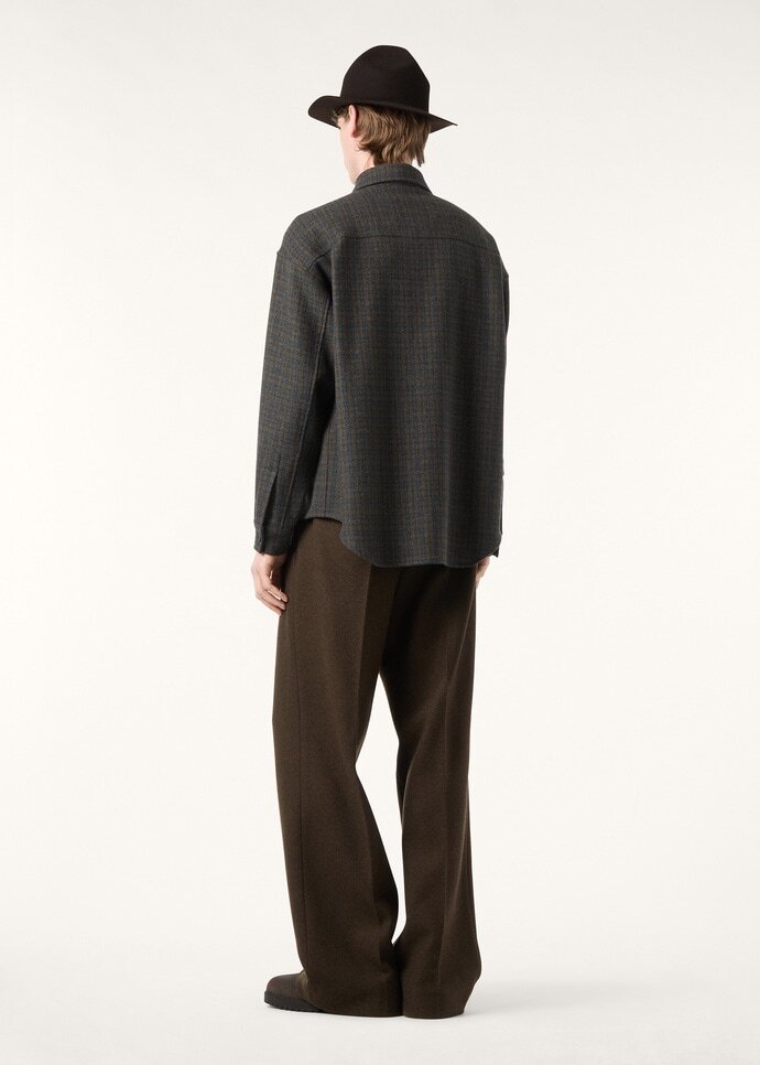 Generously cut, the Ambrose overshirt is a contemporary yet sophisticated layer. It is rendered in Elgin Check—a tactile fusion of cashmere and mohair—and has subtly puffed yarns that are reminiscent of traditional Shetland cloths. Finished with a silk-lined yoke and an open collar borrowed from the House’s André shirt, the silhouette offers a balance of structure and softness.