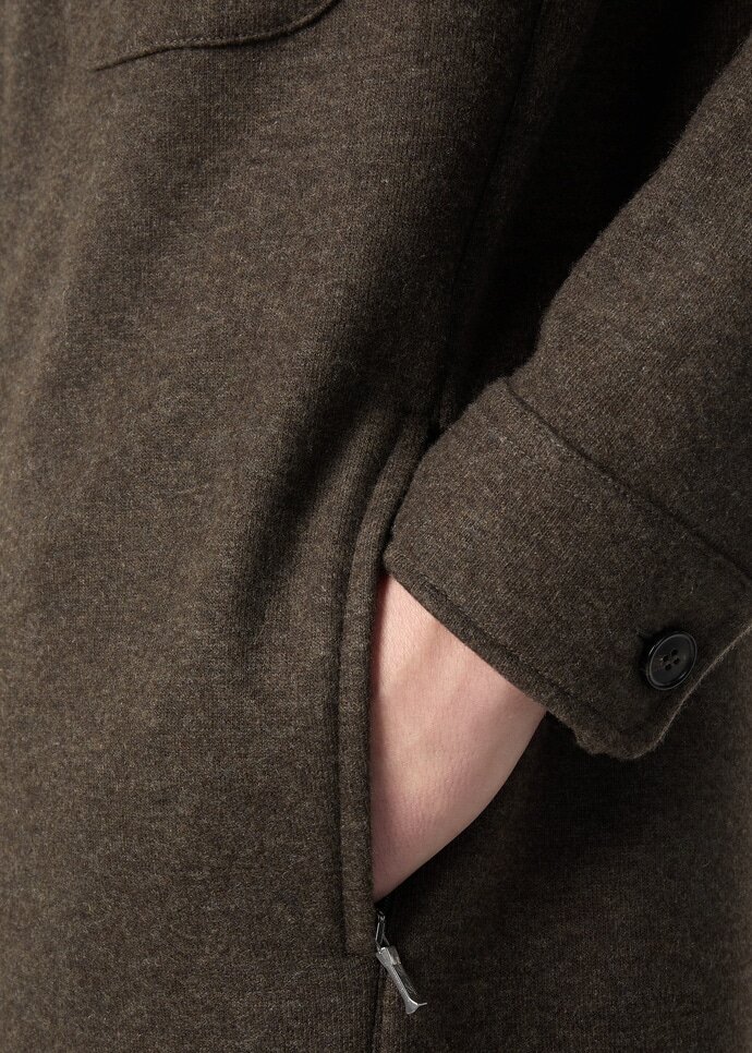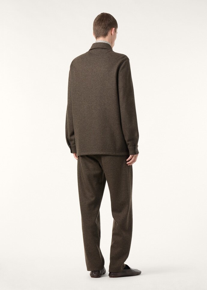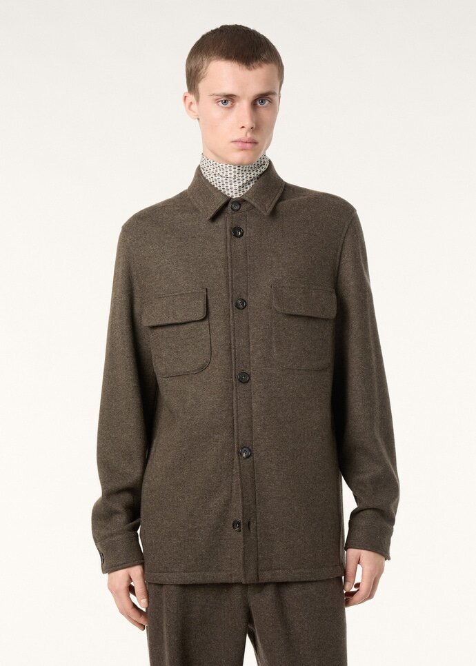 Shirt/jacket in two-tone double cashmere Jersey Novalis, our iconic lightweight yet warm naturally stretchy fabric that gently envelops the wearer. Details include a shirt-style collar and visible button fastening.