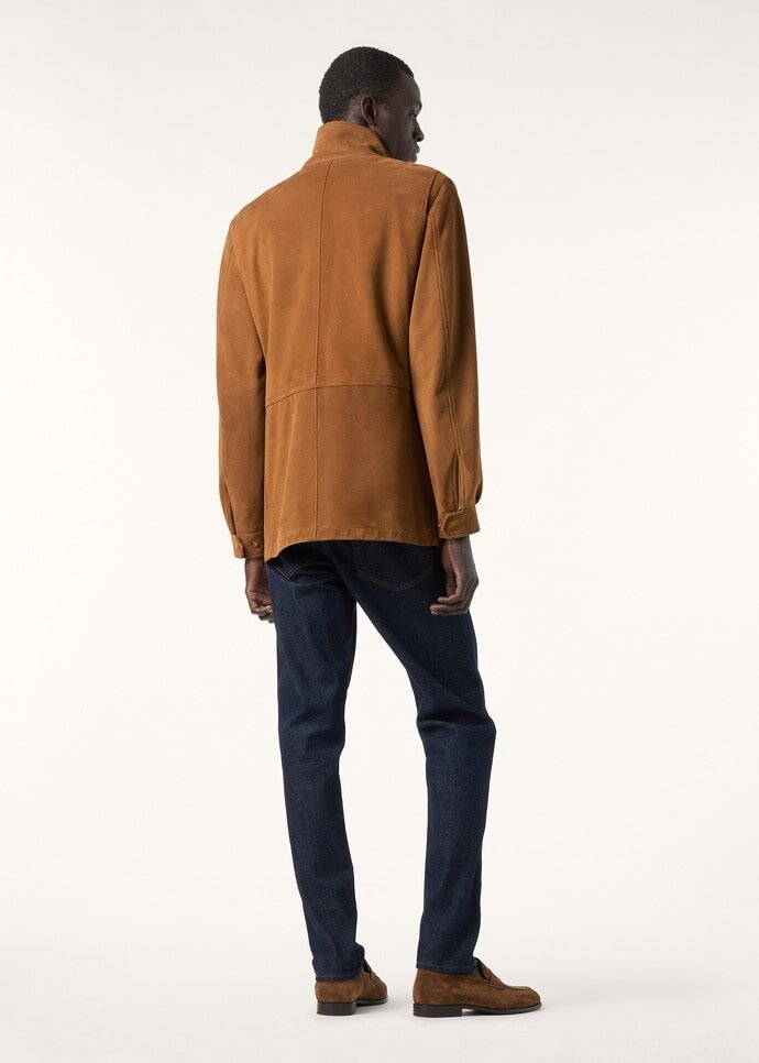 The ultimate companion for life en route, the iconic Traveller jacket combines function, versatility and comfort. It is rendered in lightweight Lowered Suede with a refined look and a smooth sensual touch. The clean-lined garment is finished with a range of multi-functional pockets to host everyday essentials.