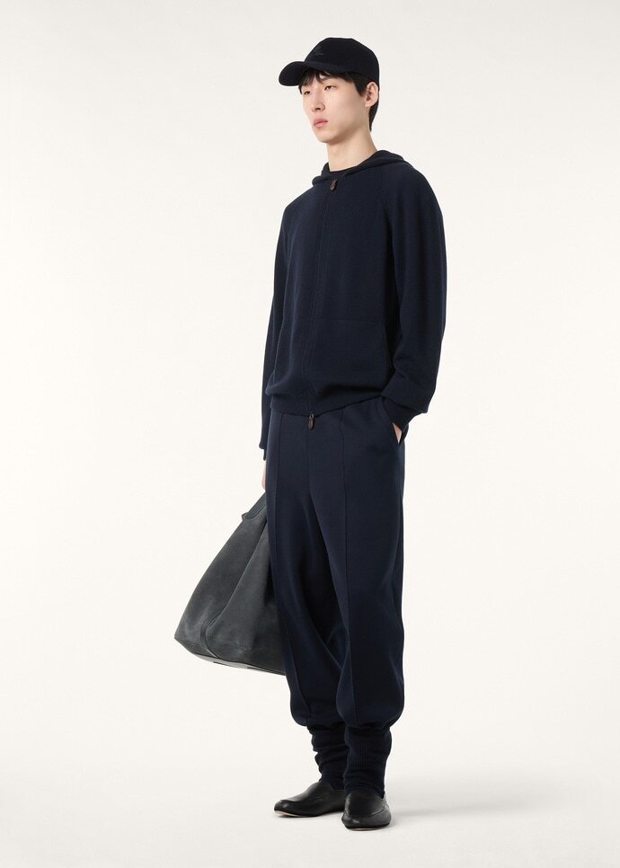 The ideal pairing partner to the eponymous pants, the Merano bomber jacket offers a refined take on relaxed dressing. It is spun from sumptuous baby cashmere, sourced from the delicate underfleece of the young Hircus goat – a fiber of incredible rarity and softness. Shaped with raglan shoulders, the silhouette is zipped at the front and finished with discreet welt pockets, lending a sleek functional line.