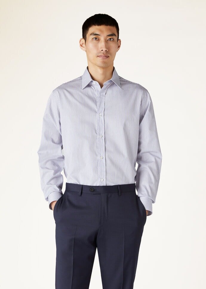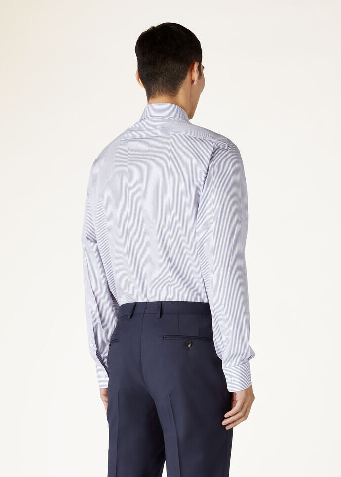 Through the rhythm of the threads, the delicate folds of origami-like precision tell a story of refinement and beauty, reflecting the nuanced artistry deeply rooted in Japanese tradition. Sophistication is effortlessly embodied in our elegant, semi-fitted, striped cotton twill shirt. Perfectly designed to complement the new suits in our range, this shirt offers a seamless blend of style and finesse for a polished ensemble.