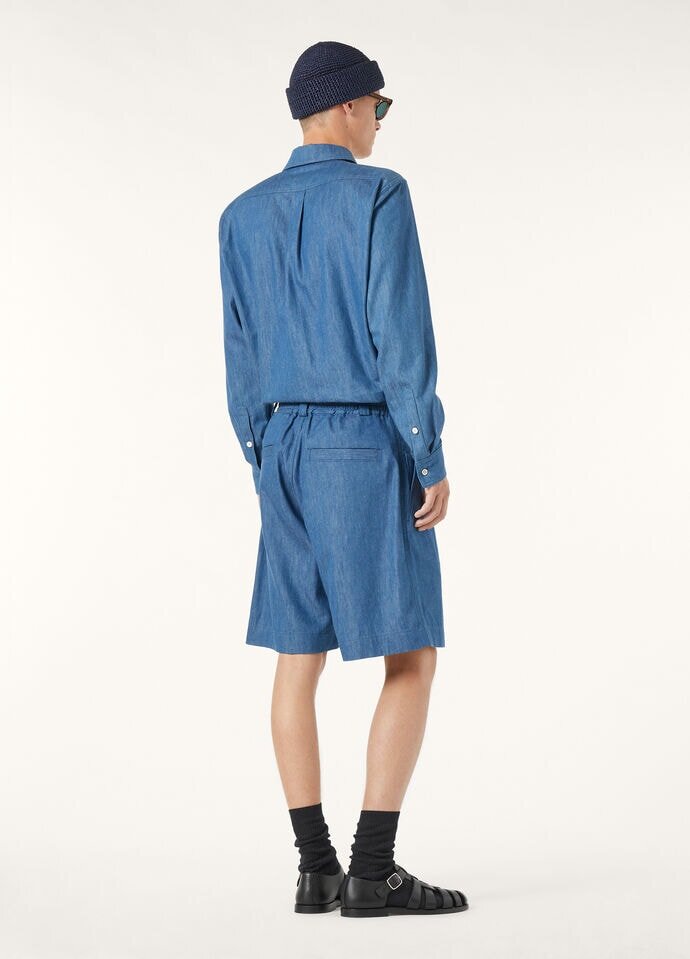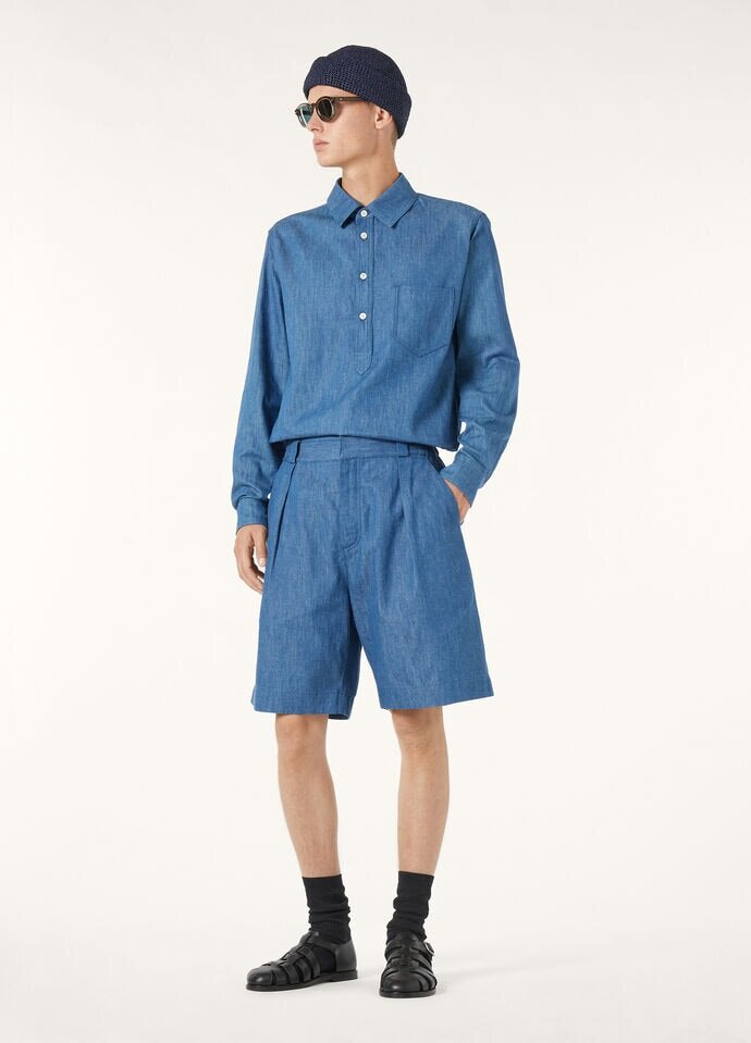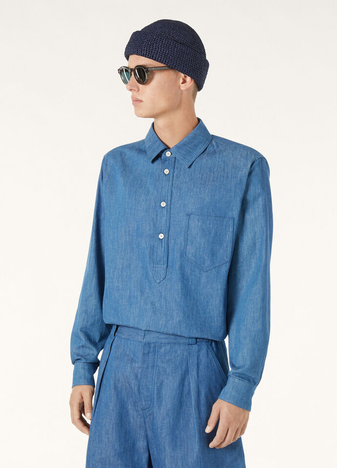 Equal parts relaxed and refined, the Evie shirt comes in a unique linen blend fused with cotton and ramie, combining the Maison’s signature sensorial touch with the denim-like look of chambray. It is dyed in a bright blue hue with subtle nuances in color, as each fiber absorbs the shade in a slightly different way. The slightly slubbed texture feels natural and authentic, bringing a characterful feel to any ensemble.