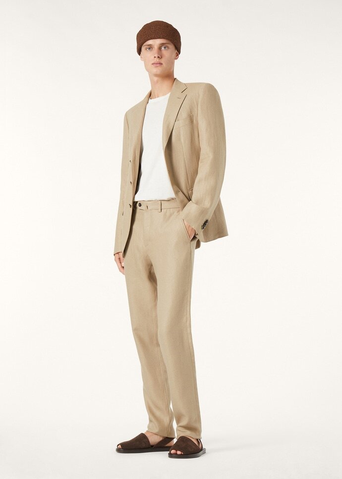 An homage to the timeless style of Sergio Loro Piana, the Torino jacket embodies the essence of sophistication. Crafted from Antigua Linen with a half-lining, it features a refined, fluid look and is resistant to creasing. Its single-breasted silhouette – complete with an edged chest pocket – is finished in line with the canons of suiting and accented with a signature thistle pin.