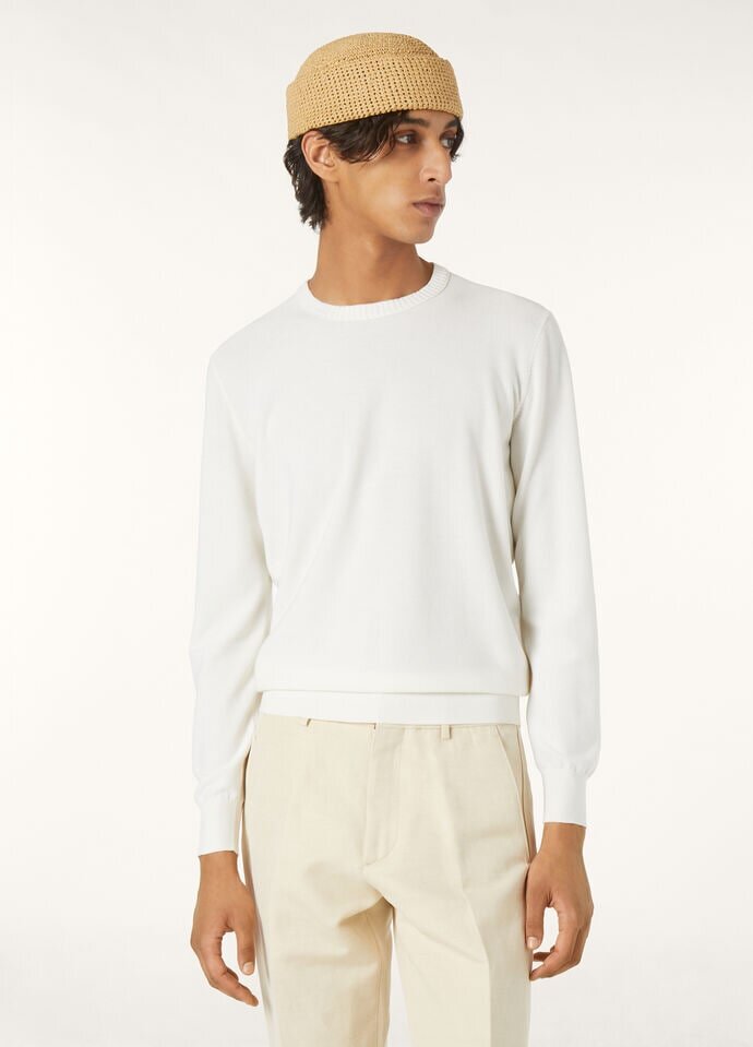 Lightweight crew neck made from extremely comfortable, silk-and-cotton yarn. This flowing, comfortable style features a draped silhouette, dropped shoulders and all-over embossed stitches.