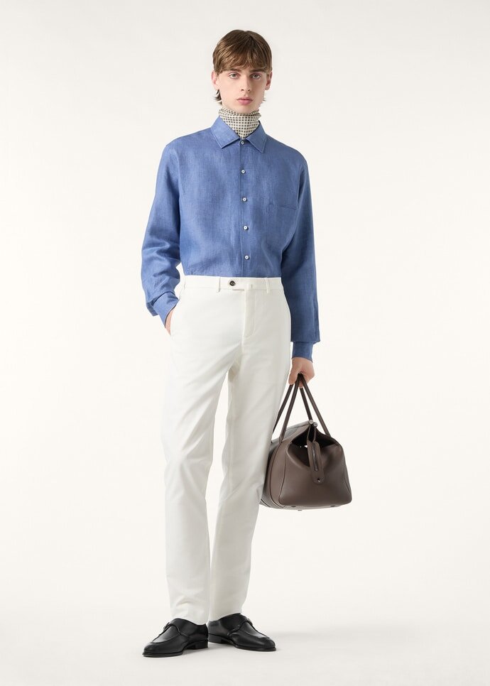 Ultra-soft cotton pants with a touch of stretch. Flat fronted and garment dyed, for an impeccable finished look. Team this versatile casual staple with a jacket or outerwear for contemporary outfits with effortless polish.