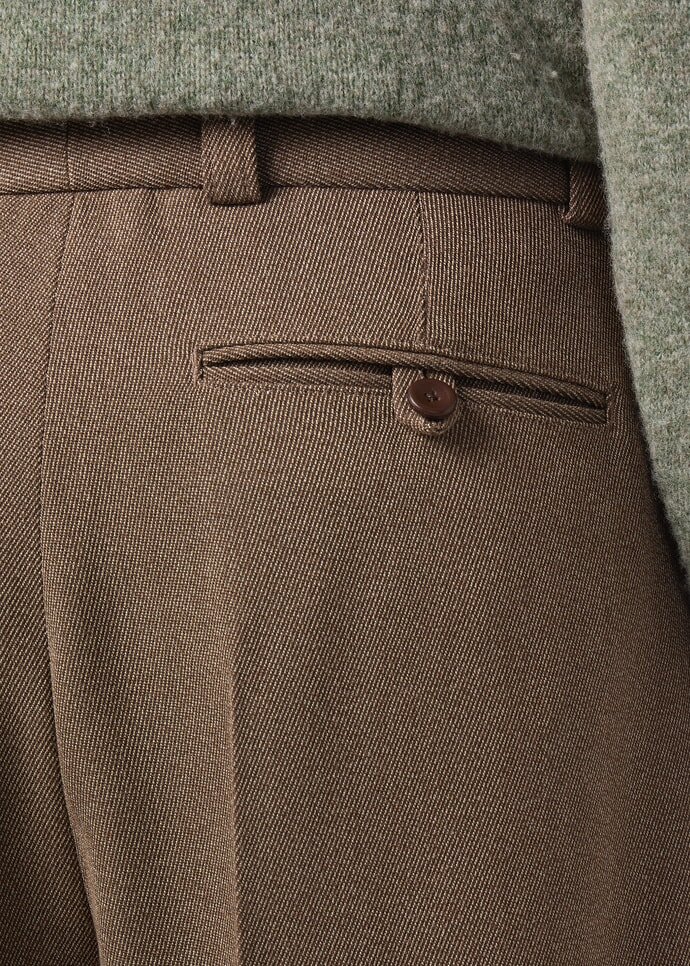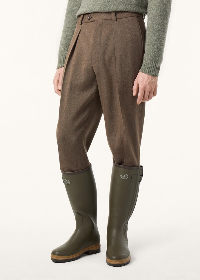 Elegantly structured, the Norfolk pants from the Loro Highlands Capsule collection are cut from mouliné wool, for a rich multi-hued effect. The relaxed design is shaped with front pleats and darts through the back and tapers into a cuffed hem secured by a leather strap and metal buckle. Leather-covered buttons accent the extended tab and welt pockets, offering a crafted counterpoint to the softly deconstructed waistband.