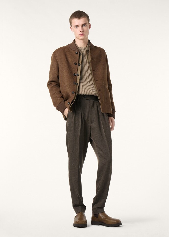 Tailored for structured ease, the Stafford pants are cut from mouliné wool. With the skilled hands of the Maison’s expert artisans, the fabric is worked for a refined, clear-cut finish. Complete with a preformed waistband and pressed creases, the silhouette casts a balanced formal line.