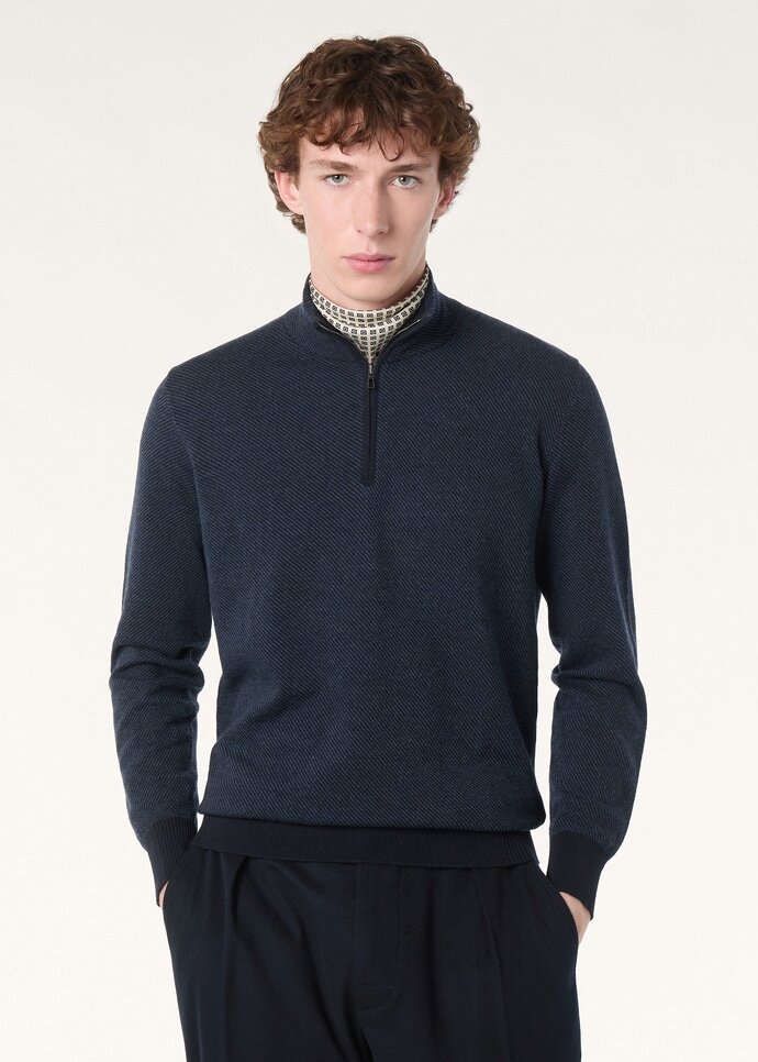 Mezzocollo sweater in cashmere crafted with a two-tone jacquard stitch. Part of the Roadster collection designed for vintage car enthusiasts, inspired by the uniform of the Loro Piana Classic Car Team. Ideal as a light-weight layer under a jacket.