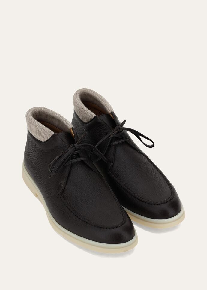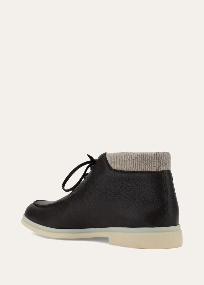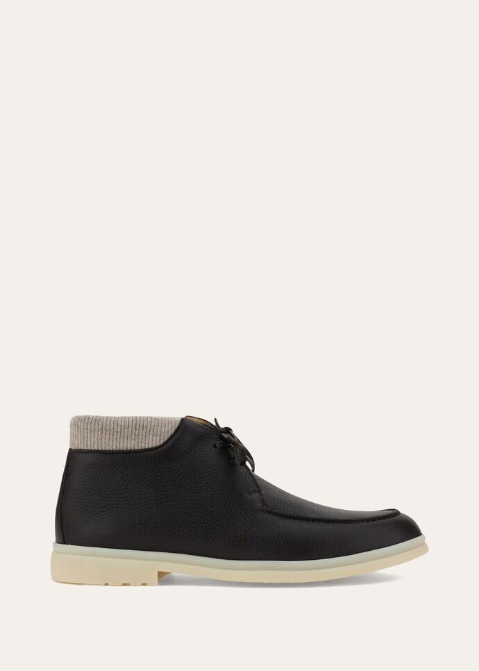 Lace-up ankle boot in butter soft deerskin. Lined in calfskin, with a lightly padded border in knitted cashmere.