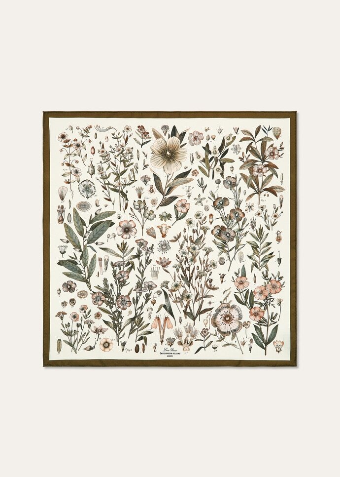 Imbued with a touch of poetry, the Enciclopedia del Lino foulard in silk twill tells the story of the Maison’s signature linen fiber, from seed to full bloom. Drawing on botanical vintage books, it showcases an intricate tale of growth and transformation, brought to life in 16 colors for a rich, nuanced watercolor effect and life-like, three-dimensional feel.