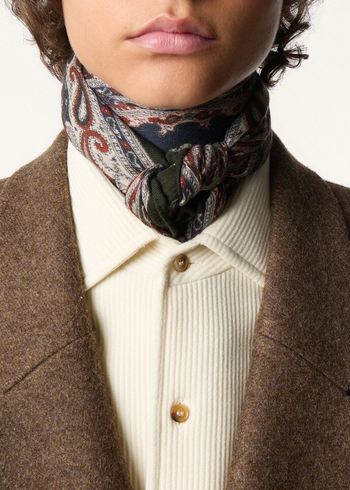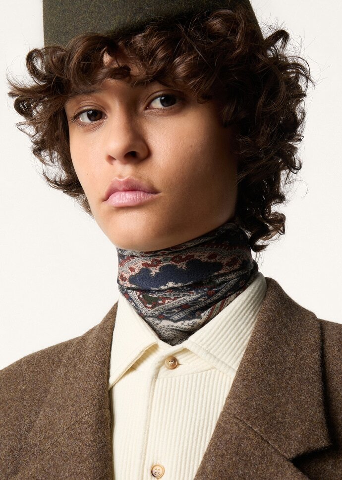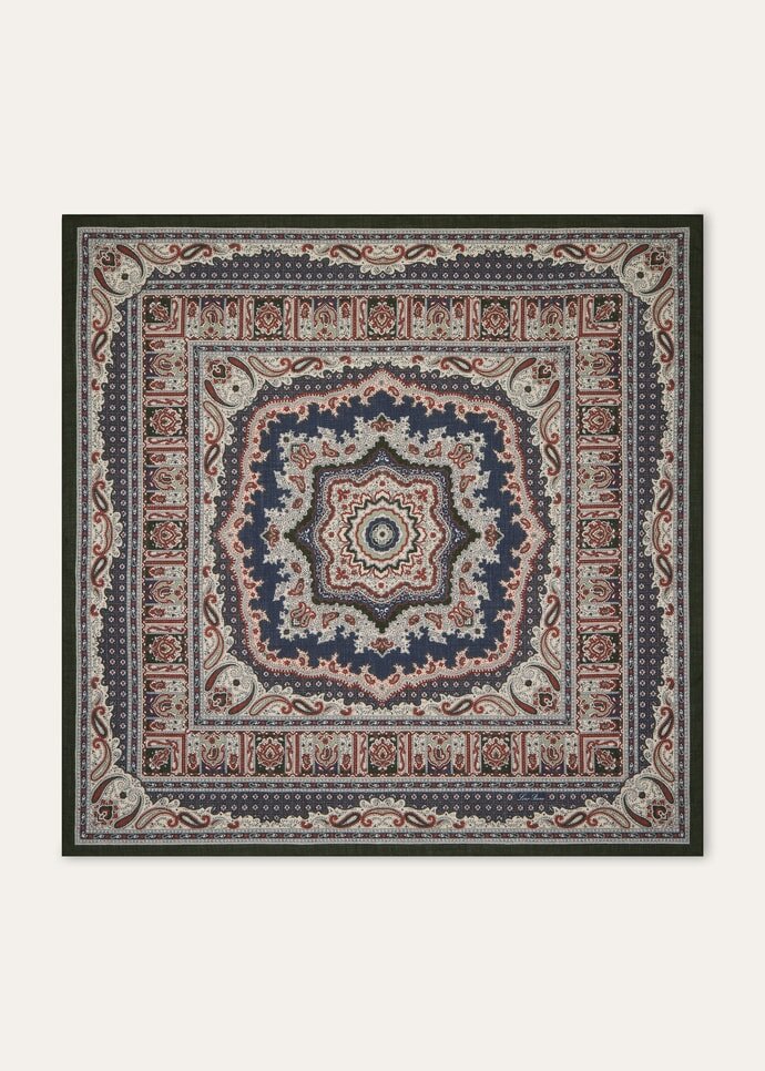 Replete with visual and tactile nuance, the Floral Majolica foulard is printed on both sides with an archival-inspired motif enriched by classic paisley accents. It is spun from pure cashmere, carefully worked in a diagonal weave to create a sophisticated mélange effect that lends depth and dimension. Finished with hand-rolled hems, it adds a polished accent when tied around the neck or to a bag.