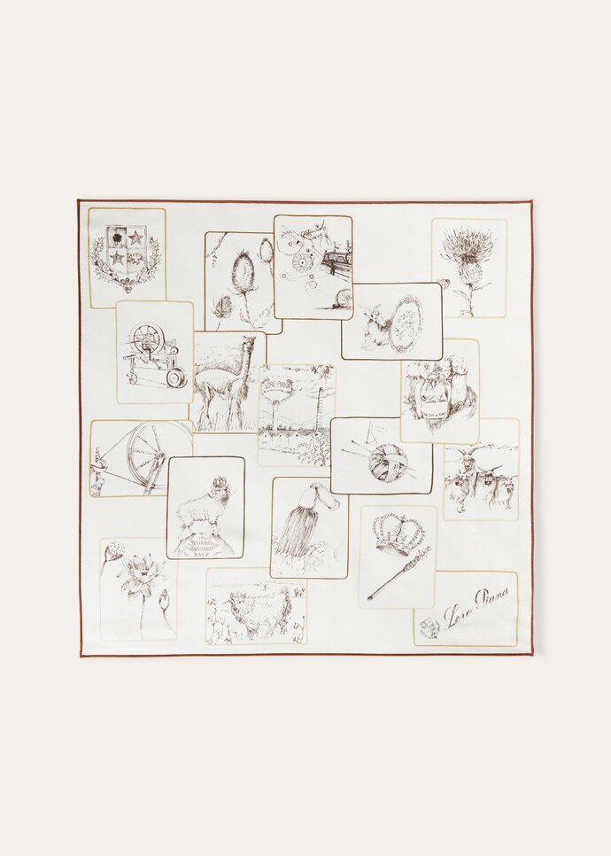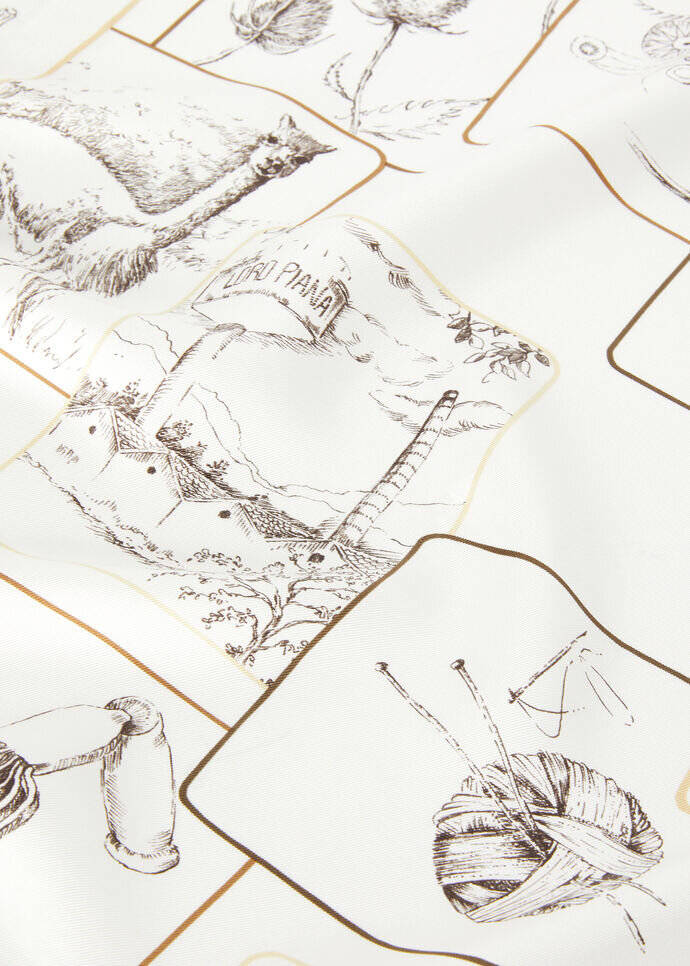 Crafted in smooth silk, the Heritage foulard is emblazoned with a print that has been specially designed to celebrate the Maison’s century-long legacy. Like an archive in foulard form, it visualizes signature emblems from Loro Piana’s history, spanning the origins of its precious animals, artisanal craft techniques, and more, allowing glimpses into an incredible story of craft and excellence.