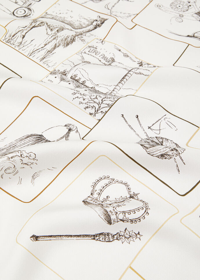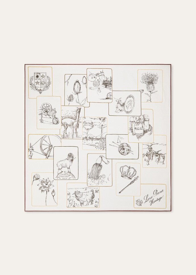 Crafted in smooth silk, the Heritage foulard is emblazoned with a print that has been specially designed to celebrate the Maison’s century-long legacy. Like an archive in foulard form, it visualizes signature emblems from Loro Piana’s history, spanning the origins of its precious animals, artisanal craft techniques, and more, allowing glimpses into an incredible story of craft and excellence.