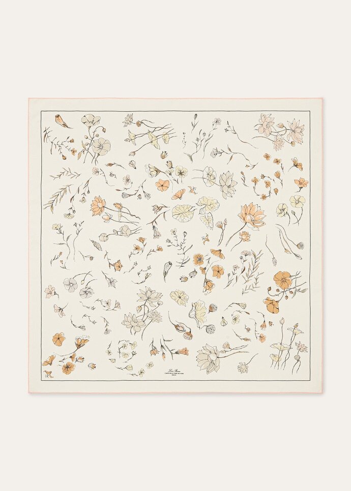 An ode to purity and grace, the L’Arte Delle Fibre Dei Fiori foulard showcases the lotus flower – a symbol of rebirth – alongside pastel-hued linen buds and cloud-like cotton flowers in an enchanting composition. It is rendered in pure silk twill, with trims rolled and stitched by hand in a final expression of detail-attuned craftsmanship.