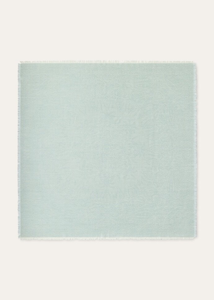 The elegance of Indian tapestry lends a sense of timeless beauty to the Punjab foulard, where paisleys and blooms emerge from the center in balanced symmetry. Screen-printed with fine precision, the design reveals layered details and subtle linework that evoke the character of hand-drawn textile art. The accessory is jacquard-woven from a featherlight blend of cashmere and silk – an elevated canvas for the refined complexity of the motif.