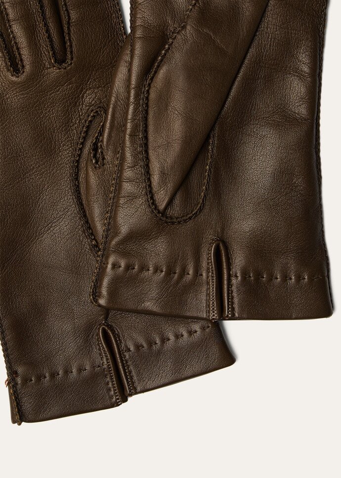 Distinguished by visible ribbing and diagonal edge stitching, the Edith gloves are an essential accessory for in-between styling. They are shaped from butter-soft Plongé leather into an elegant, minimal design. A discreet outer wrist slit allows for ease of wear, with an interior that reveals a Kummel-toned cashmere silk lining to lend a refined sensorial finish.