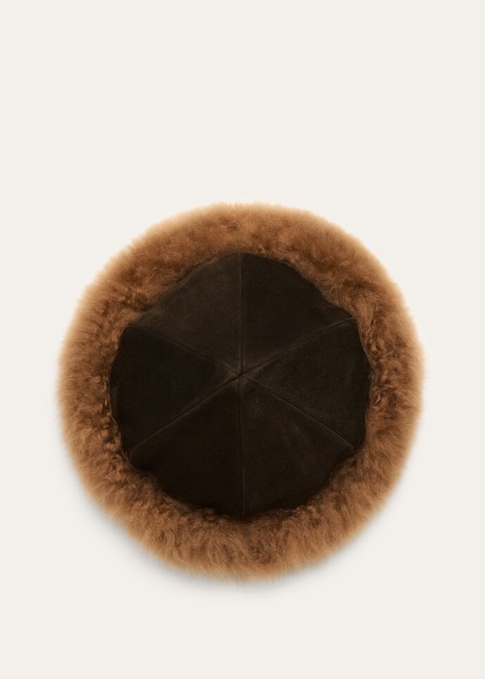 Structured yet infinitely soft, the Kyle hat is crafted from cash suede leather and constructed in six precise panels. Its gently pointed crown is encircled by a wide trim in airy baby alpaca on the base, lending a sumptuous tactile contrast. Lined in quilted silk twill and lightly padded, it cocoons the head in enveloping warmth and refinement.